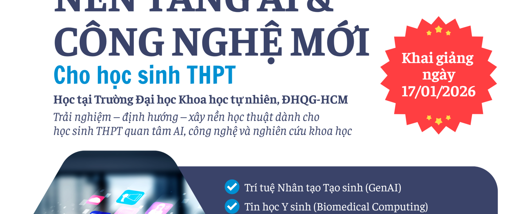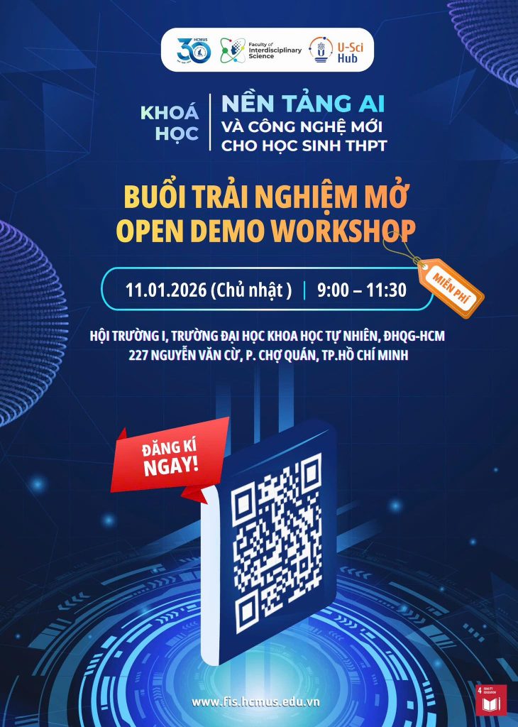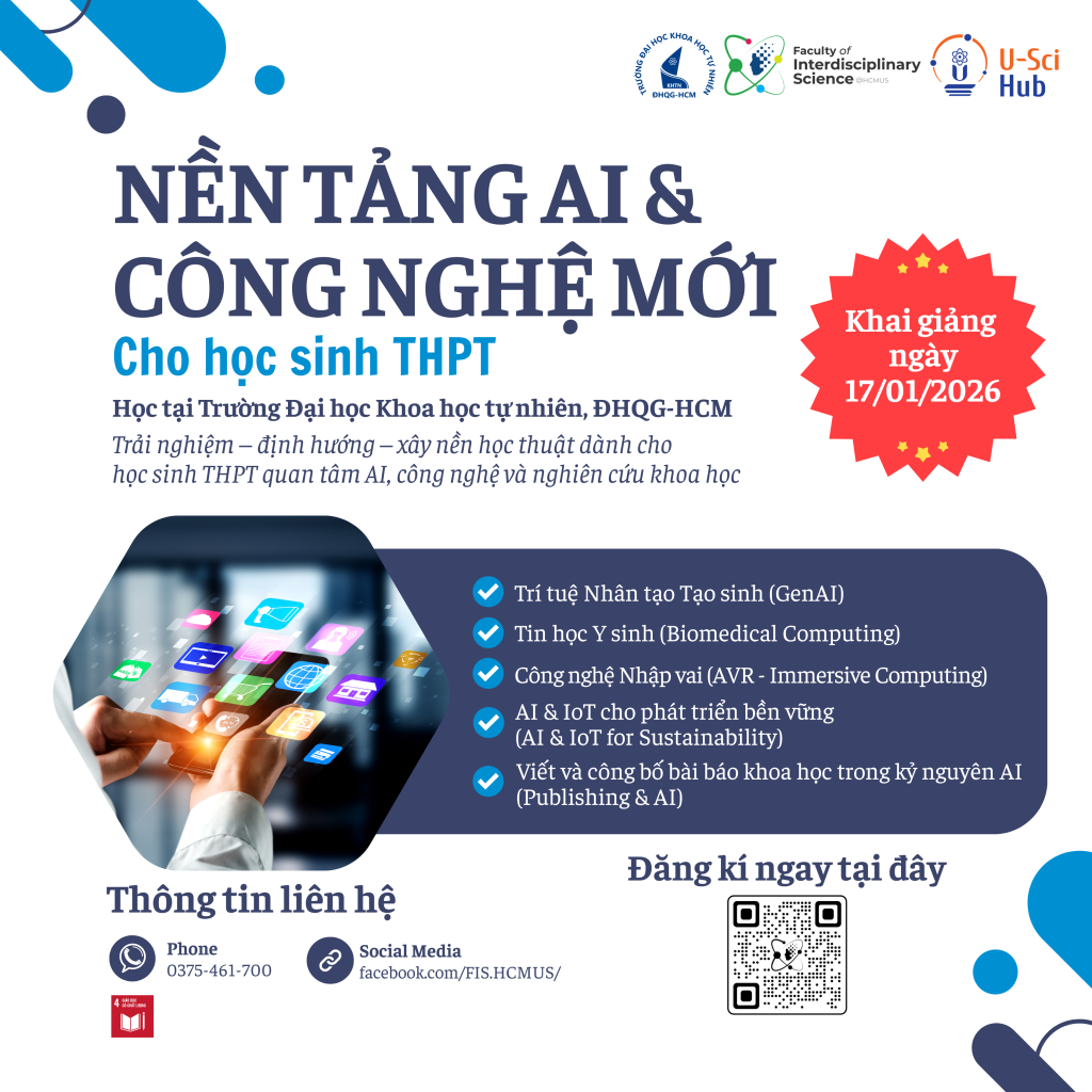 Nhằm giúp học sinh THPT sớm tiếp cận Trí tuệ nhân tạo (AI) và các công nghệ mới nổi, Trường Đại học Khoa học tự nhiên, ĐHQG-HCM, Khoa Khoa học Liên ngành và U-sci hub tổ chức chương trình “Nền tảng AI & Công nghệ Mới cho Học sinh THPT”, gồm Buổi Trải nghiệm Mở miễn phí và Khóa học chính thức chuyên sâu.