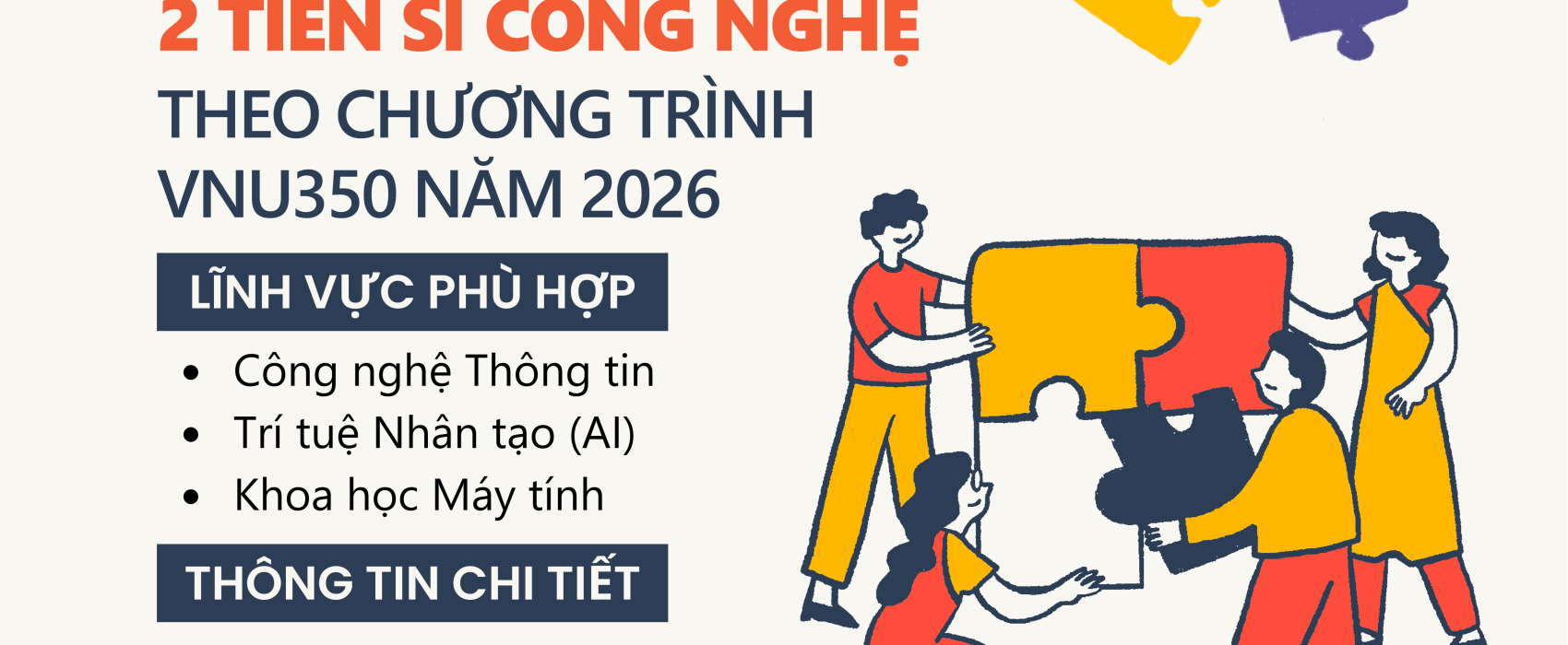 Nhằm tăng cường đội ngũ nghiên cứu và giảng dạy chất lượng cao, Khoa Khoa học Liên ngành thông báo tuyển dụng 02 Tiến sĩ Công nghệ theo Chương trình VNU350 năm 2026.